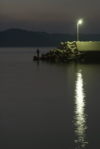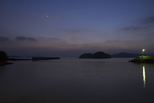 人気もまばらな小さい漁港の向こうに