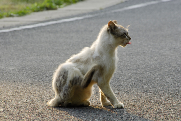 その途中でちょっと回り道しながら行ったんですが、猫が道をふさいで動きません。田舎の猫は肝っ玉が座ってるのか、おおらかなのか分かりませんがとにかく一向に動く気配が無いので、ついでに撮影してやりました。逆行で毛先が光ってる具合を試してみようと思い狙って撮影してみました。