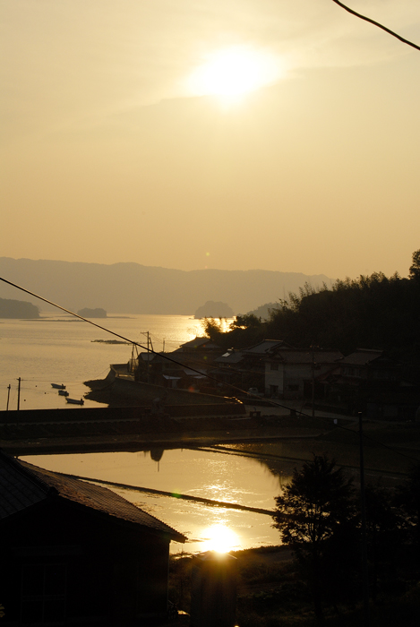 そこからしばらく海沿いの細い道を車で走らせてるとちょっと開けた景色が出たときに、いい感じで太陽が出てて、いい感じの海の反射と田んぼへの反射を見つけましたのでコレも撮影して試してみようと撮影。D70では同じシチュエーションで撮影すると必ず白飛びしまくりの条件です。